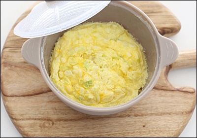 3단계, 전자렌지 용기에 체에 걸러 부어주세요. 이렇게 걸러주면 훨씬 더 매끈하고 식감 좋은 계란찜이 돼요. 그 다음, 랩이나 뚜껑을 살짝 덮고, 전자렌지에 700~800W 기준으로 2분 30초에서 3분 정도 돌려주세요.