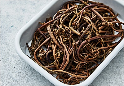 건고사리는 색이 너무 검지 않고, 회갈색에 가까운 것이 좋아요. 줄기가 너무 두껍지 않으면서 부드럽게 구부러지는 것이 삶았을 때 질기지 않고 부드러워요. 너무 마른 느낌보다는 살짝 유연한 것이 신선한 편이에요.