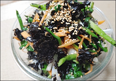 채소와 함께 김샐러드를 만들 수도 있어요. 상추, 로메인, 오이, 방울토마토와 조합이 좋아요. 🥗