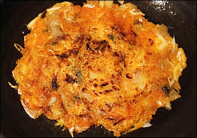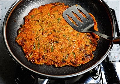 두껍게 부치면 안쪽까지 익히기 위해 오래 구워야 해서 질척해질 수 있어요. 숟가락이나 뒤집개로 얇게 펼쳐주면 훨씬 바삭한 결과물이 나와요. 특히 테두리 부분은 살짝 눌러서 구워보세요.