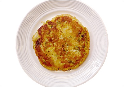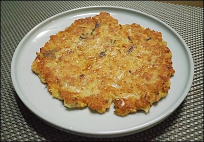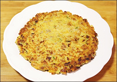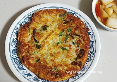 ④ 달군 팬에 기름을 넉넉히 두른 뒤, 반죽을 국자로 떠 넣고 앞뒤로 노릇하게 부쳐주세요. 중불에서 천천히 익혀야 속까지 잘 익고 바삭한 식감이 살아나요.