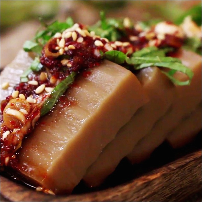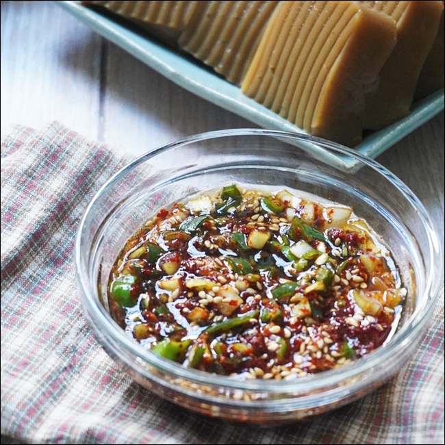 두 번째는 ‘채소 양념장’이에요. 양념장에 잘게 썬 오이, 양파, 부추, 깻잎 등을 추가해보세요. 아삭한 식감 덕분에 묵의 부드러움과 대비되어 훨씬 더 맛있게 느껴져요. 마치 무침 요리처럼 색다른 경험이 가능해요.