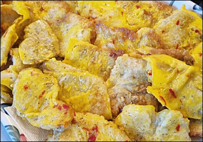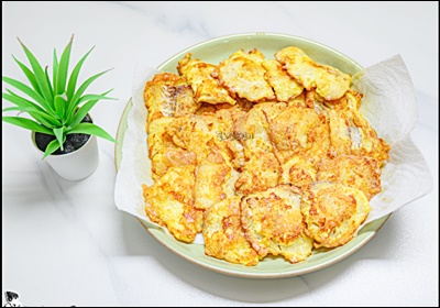 한쪽 면이 익으면 조심스럽게 뒤집고, 양면이 노릇노릇하게 구워지면 키친타월 위에 올려 기름기를 빼줘요. 깔끔한 전은 기름 정리가 잘 된 전이에요! 접시에 가지런히 담으면 동태전 완성! 🐟