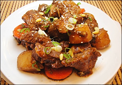플레이팅: 넓은 접시에 무·감자를 먼저 깔고 갈비를 위에 쌓아 높이를 만들어요. 남은 소스를 숟가락으로 떠 윤광이 나게 끼얹고, 쪽파·깨를 뿌려 마무리해요. 김치·깍두기·상추와 궁합이 좋아요.
