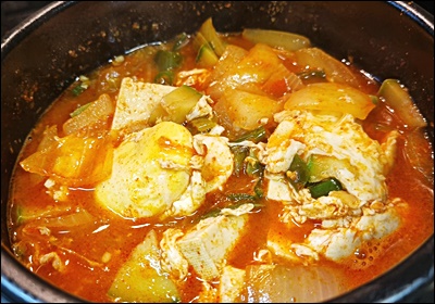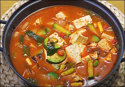 다음으로 준비해둔 육수를 붓고 끓이기 시작해요. 이때 양파, 애호박, 김치 등을 함께 넣어 끓이면 채소에서 자연스러운 단맛과 풍미가 우러나오죠. 육수가 끓기 시작하면 두부를 투입하는데, 두부는 큼직하게 썰어야 끓이면서도 부서지지 않아요.