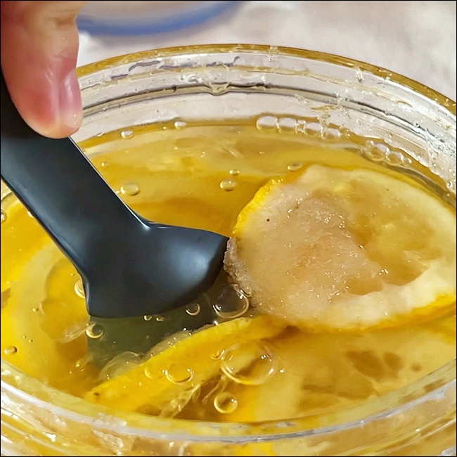 중간에 한 번쯤 병을 살짝 흔들어 설탕과 레몬이 골고루 섞이게 해주세요. 단, 너무 자주 흔들면 과육이 쉽게 무를 수 있으니 하루 1회 정도가 좋아요.