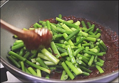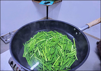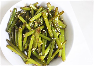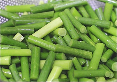 3~4cm 길이로 썬 마늘쫑을 끓는 물에 소금 약간 넣고 20초만 데쳐주세요. 너무 오래 데치면 식감이 죽어요. 바로 찬물에 헹구는 것도 잊지 마세요!