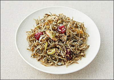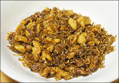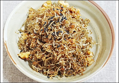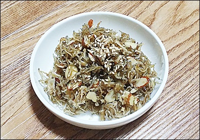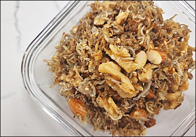 가장 많이 사용하는 재료는 **땅콩, 아몬드 슬라이스, 호두**예요. 멸치와 고소한 견과류의 조합은 꿀조합! 기름에 한번 튀긴 견과류를 넣으면 더 바삭하고 오랫동안 눅눅해지지 않아요.