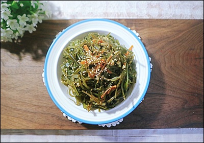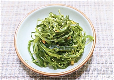 | 미역줄기 | 염분 제거 + 데친 후 물기 제거 | 5cm 길이로 썰기 |