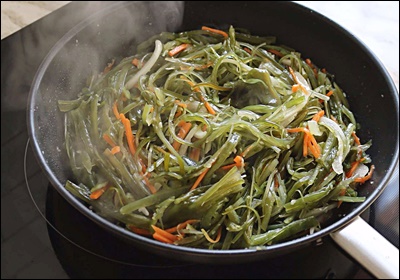 이제 미역줄기를 넣고 중불에서 재빨리 섞어가며 볶아요. 이때 소금 약간과 국간장 1작은술을 넣어 간을 맞춰요. 센 불은 금물! 미역이 질겨질 수 있으니 항상 중불을 유지해 주세요. 3~5분 정도면 충분해요.