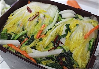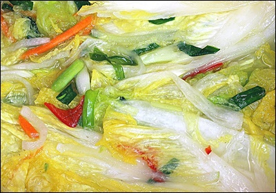 1. 절인 배추를 깨끗하게 씻고 물기를 완전히 빼주세요. 2. 속재료를 준비해서 배추 사이사이에 살짝 넣어요. 3. 큰 용기에 배추를 담고 육수를 붓는데, 배추가 잠길 정도로 충분히 부어야 해요. 4. 실온에 하루 두었다가, 김치냉장고나 냉장실로 옮겨 숙성시켜요.