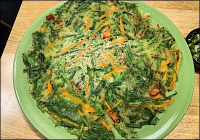 ④ 앞뒤로 바삭하게 구워졌다면, 키친타올을 깐 접시에 올려 기름을 살짝 빼주세요. 그리고 먹기 좋은 크기로 잘라 접시에 담고, 양념장을 곁들이면 완성! 부추 향이 고소하게 퍼질 거예요 🧅