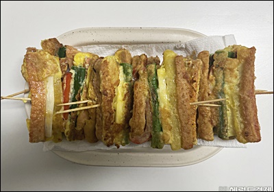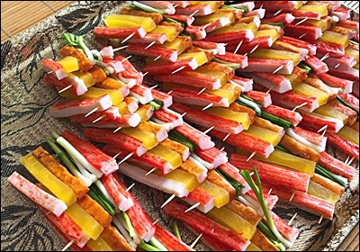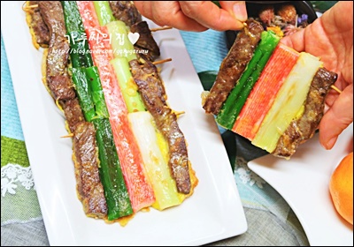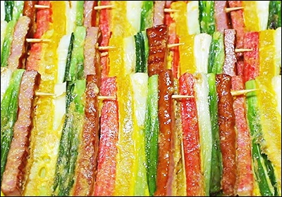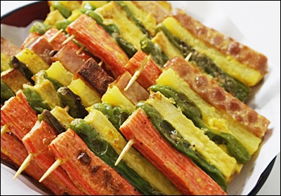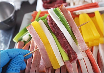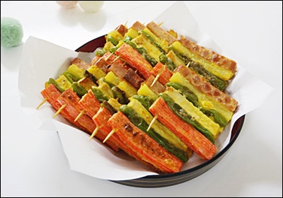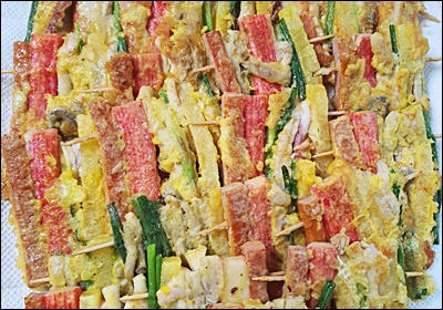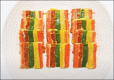 꼬치는 나무꼬치를 사용해도 좋고, 쇠꼬치를 사용해도 괜찮아요. 다만 나무꼬치는 타지 않도록 물에 10분 정도 담갔다가 사용하는 게 좋아요. 그리고 손에 꼬치를 잡고, 한 재료씩 밀어넣을 때는 반듯하게 정렬해야 모양이 예쁘게 나와요.