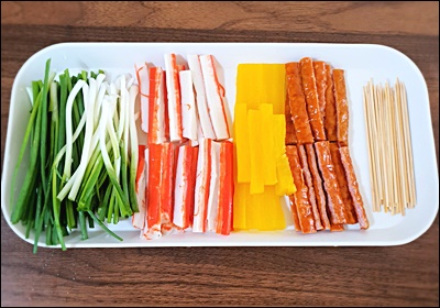 재료를 썰 때는 두께와 길이를 일정하게 맞추는 것이 중요해요. 그래야 꼬치에 꽂았을 때 모양이 예쁘고 익는 시간도 비슷하거든요. 특히 계란은 지단으로 부쳐서 길게 썰고, 당근과 애호박은 살짝 데쳐 부드럽게 만든 뒤 사용하면 좋아요.