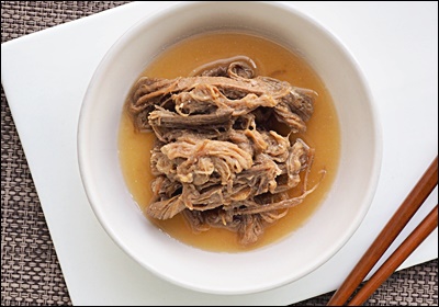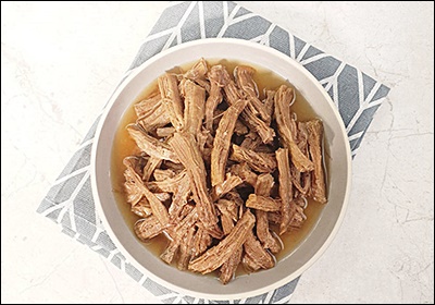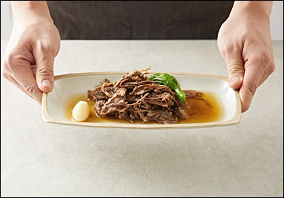 삶은 고기는 한 김 식힌 뒤, 결 따라 손으로 찢어주세요. 이 과정에서 식감을 좌우하는 결 정리가 돼요. 나중에 양념에 졸일 때 양념도 쏙쏙 스며들게 되죠.