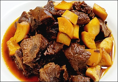 소고기를 구매할 때는 선홍빛이 돌면서 마블링이 너무 과하지 않은 고기를 고르는 것이 좋아요. 너무 기름진 부위는 졸이는 동안 느끼해질 수 있답니다.