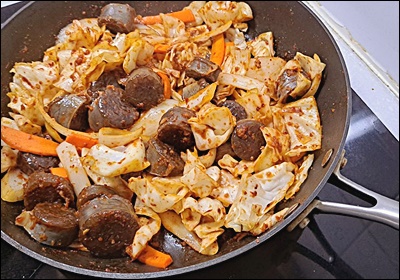 이제 손질한 양파와 양배추, 당근을 투입! 야채는 너무 오래 볶지 말고 중불에서 1~2분 정도만 빠르게 볶아주세요. 아삭한 식감을 살려야 씹는 재미가 살아나거든요. 야채를 어느 정도 익힌 후, 손질된 순대를 넣고 함께 볶아줍니다. 이때부터는 불 조절이 핵심이에요.