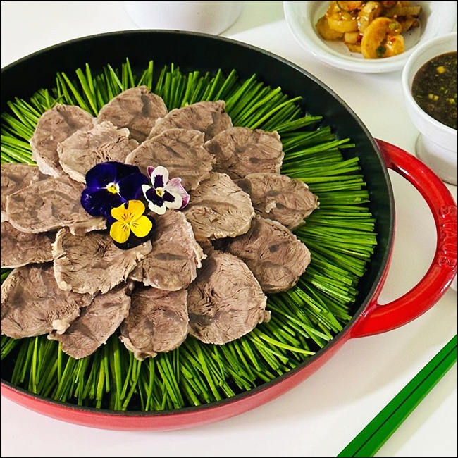 손질한 고기는 덩어리째 삶는 게 좋아요. 미리 썰면 육즙이 빠지고 고기결이 퍼져 식감이 떨어지거든요. 삶은 후 식혀서 써는 게 가장 좋아요. 부피가 클수록 속까지 잘 익히기 위해 삶는 시간도 조절해야 해요.