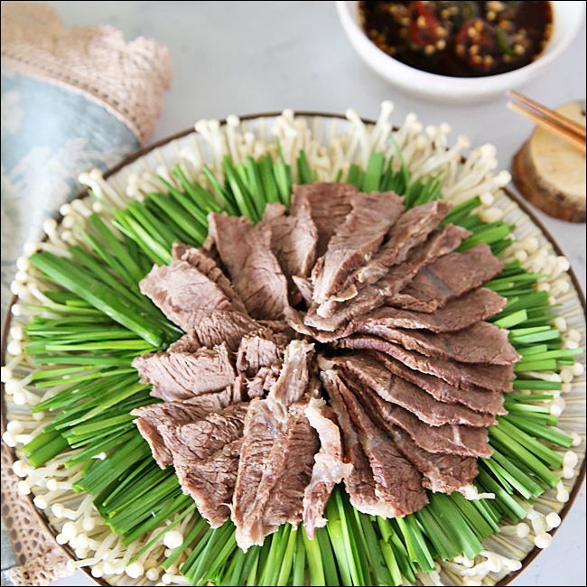 먼저 국물 속에서 10분간 자연스럽게 식혀준 후 꺼내서 실온에서 20~30분 완전히 식혀요. 그다음 얇은 칼로 고기의 결 반대 방향으로 썰어줘야 부드럽고 모양도 예쁘게 잘려요. 너무 얇게 썰면 씹는 맛이 줄어요.