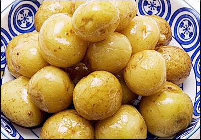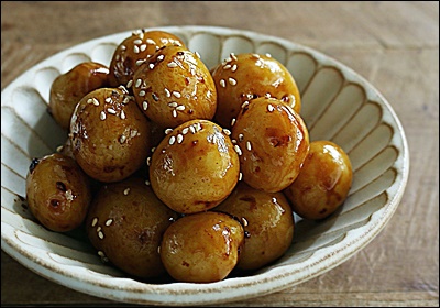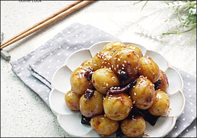 껍질이 두껍거나 색이 어두운 감자는 껍질을 벗겨도 돼요. 하지만 얇고 윤기 나는 감자라면 껍질째 조리해도 감칠맛이 살아 있어요. 깨끗하게 세척한 알감자는 한번 데쳐서 조림에 사용하는 게 훨씬 맛있어요.