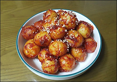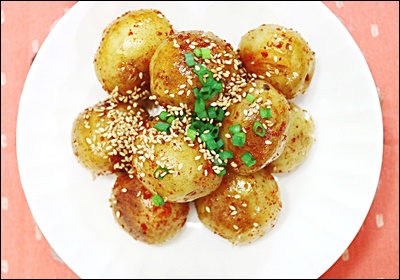 또 하나의 팁은 팬을 자주 젓지 않고 팬을 좌우로 흔드는 것! 이렇게 하면 감자 모양이 그대로 유지되고 양념이 고루 묻어요. 팬이 작으면 감자끼리 눌려서 부서질 수 있으니 조금 넓은 팬을 사용하는 걸 추천해요.