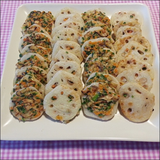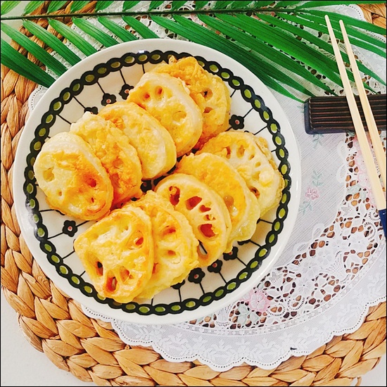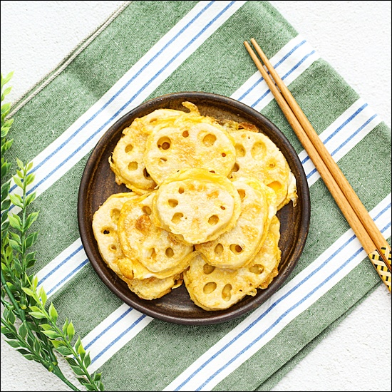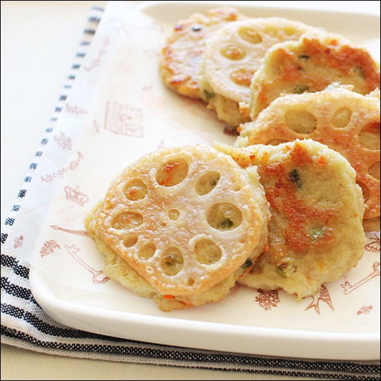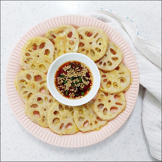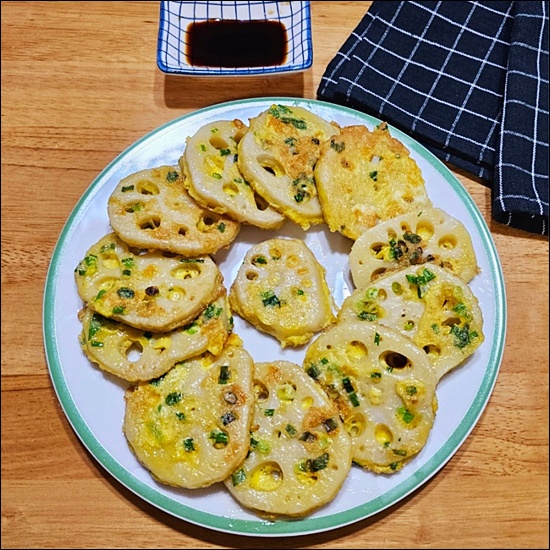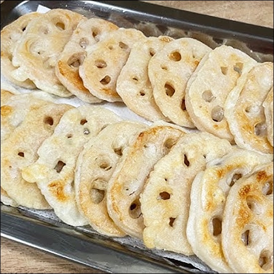 모양을 더 예쁘게 만들고 싶다면 부치기 전에 연근 구멍 사이에 밀가루나 반죽이 흘러나오지 않도록 잘 정리하고, 팬에 올릴 때는 구멍 쪽이 보이게 배치해주면 플레이팅이 훨씬 예뻐요. 🤗