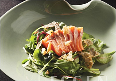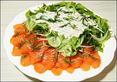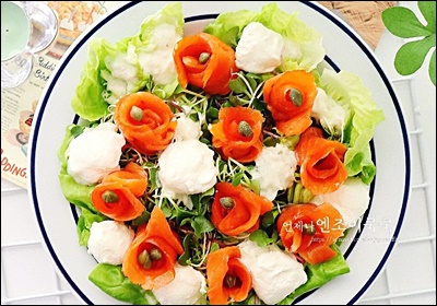 3) 연어 올리기: 연어를 넓은 면이 보이게 부채꼴로 얹어요. 생연어는 소금·후추 톡, 훈제는 레몬즙만 살짝. 케이퍼·딜을 중간중간 꽂아 향의 리듬을 만들어요.