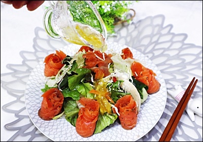 간장 유자: 올리브오일 2.5, 유자즙 1, 간장 1, 꿀 0.5, 식초 0.5, 참깨 약간. 동양적 향이 살짝 올라연어 지방감과 균형이 맞아요. 케이퍼를 줄이고 김가루를 소량 추가해도 좋아요.