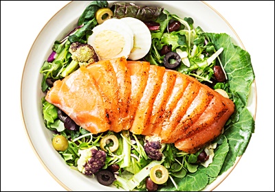 A4. 연어 120g, 잎 120g, 요거트 드레싱 30ml로 시작해요. 너트 대신 해바라기씨 1큰술로 식감만 살려요.