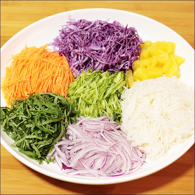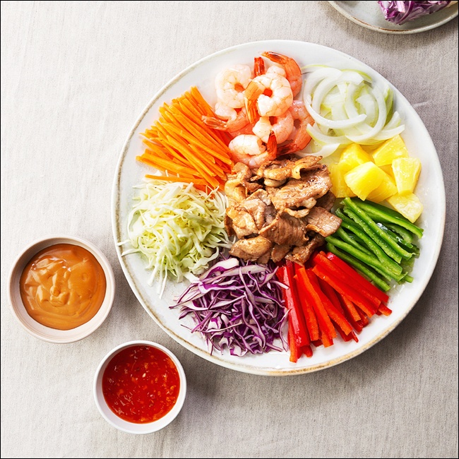 이제 싸는 순서! 쌈의 정중앙 아래쪽에 쌀국수를 얇게 깔고, 그 위에 단백질(새우나 닭고기 등)을 올리고, 채소는 위에 컬러를 섞어서 배치해요. 깻잎이나 파프리카, 적채처럼 색이 진한 채소는 바깥쪽으로 나와야 모양이 예쁘게 나와요. 모양은 가로로 말아도 좋고, 세로로 말아 미니 김밥처럼 만들어도 좋아요.