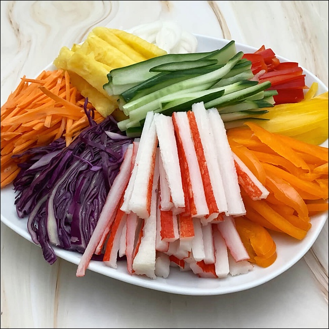 A4. 오이, 당근, 깻잎, 상추, 적양배추, 파프리카 등 아삭한 채소들이 좋아요. 색감을 고려해서 넣으면 보기도 예쁘고 식감도 풍부해져요.