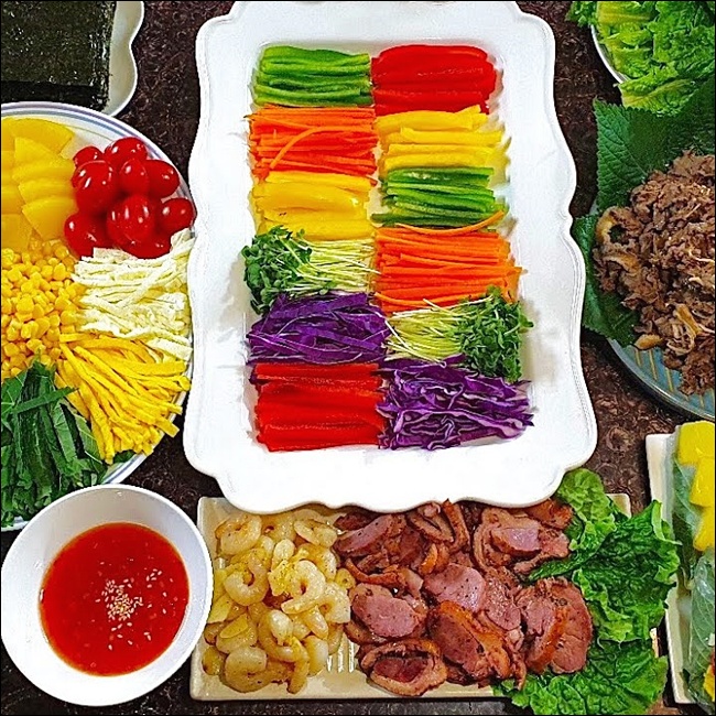각 재료는 색깔별로 정렬해서 플레이팅하는 게 포인트예요. 예를 들어 오렌지색 파프리카, 초록 깻잎, 붉은 적채를 옆으로 나란히 놓으면 자연스레 컬러가 눈을 끌어요. 접시도 하얀색, 나무, 블랙 세라믹 등을 활용하면 더욱 고급스럽게 보여요. 🌈