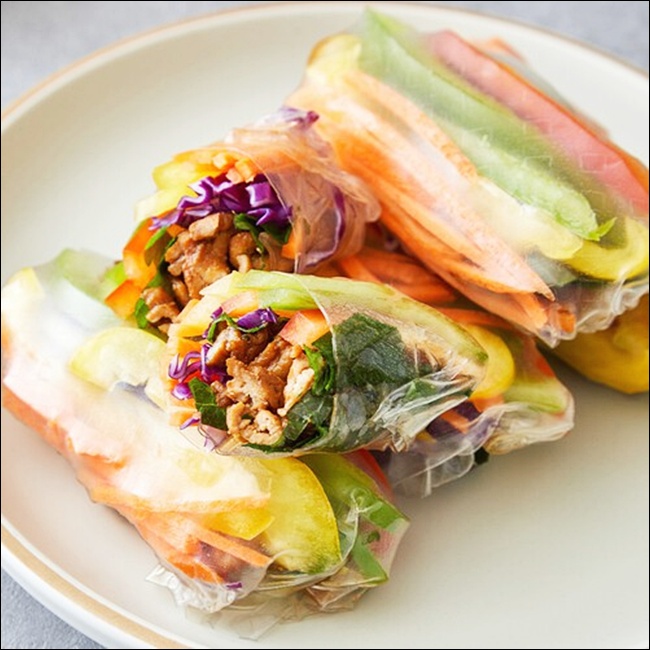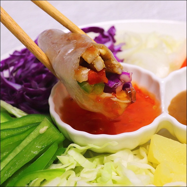 단백질은 삶은 닭가슴살, 소고기, 새우, 훈제연어, 오리고기 등 원하는 대로 선택할 수 있어요. 베트남 스타일을 원한다면 새우와 돼지고기를 추천해요. 닭가슴살은 다이어트 중인 분들에게 인기고, 훈제연어나 오리는 고급스러운 느낌을 더해주죠. 단백질은 미리 조리해 식혀서 넣어야 라이스페이퍼가 흐물흐물해지지 않아요.