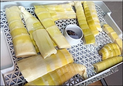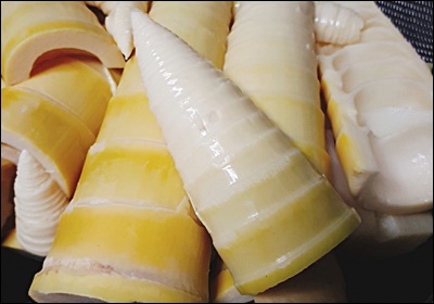 죽순을 활용할 때는 너무 오래 삶으면 부드럽지만 식감이 죽고, 너무 덜 삶으면 떫은맛이 남아요. 삶기 전 단면을 잘라봤을 때 색이 노르스름하고 수분이 많아 보이면 아주 좋은 상태예요. 이 상태에서 부드럽게 삶아내야 요리에 최적이에요!