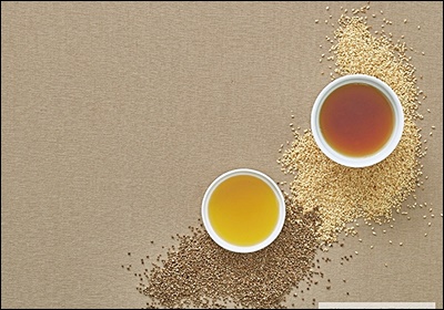 다음은 ‘색깔’이에요. 신선한 참기름은 맑고 투명하며 적당히 황금빛을 띄는데, 산패된 참기름은 탁해지고 약간 어두워져요. 빛깔이 탁하고, 입구에 끈적한 기름 찌꺼기가 끼어 있다면 교체 시기예요.
