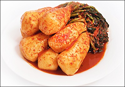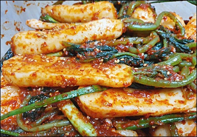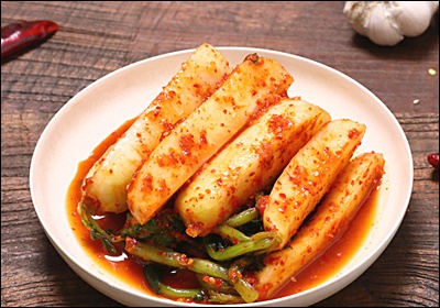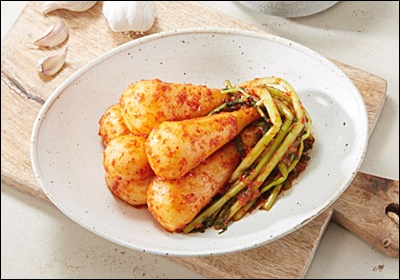 총각김치는 뿌리채소의 아삭한 식감과 매콤한 양념이 어우러져 밥도둑 김치로 사랑받고 있어요. 특히 잘 익었을 때 그 깊은 감칠맛은 밥 한 공기를 뚝딱 사라지게 하죠!